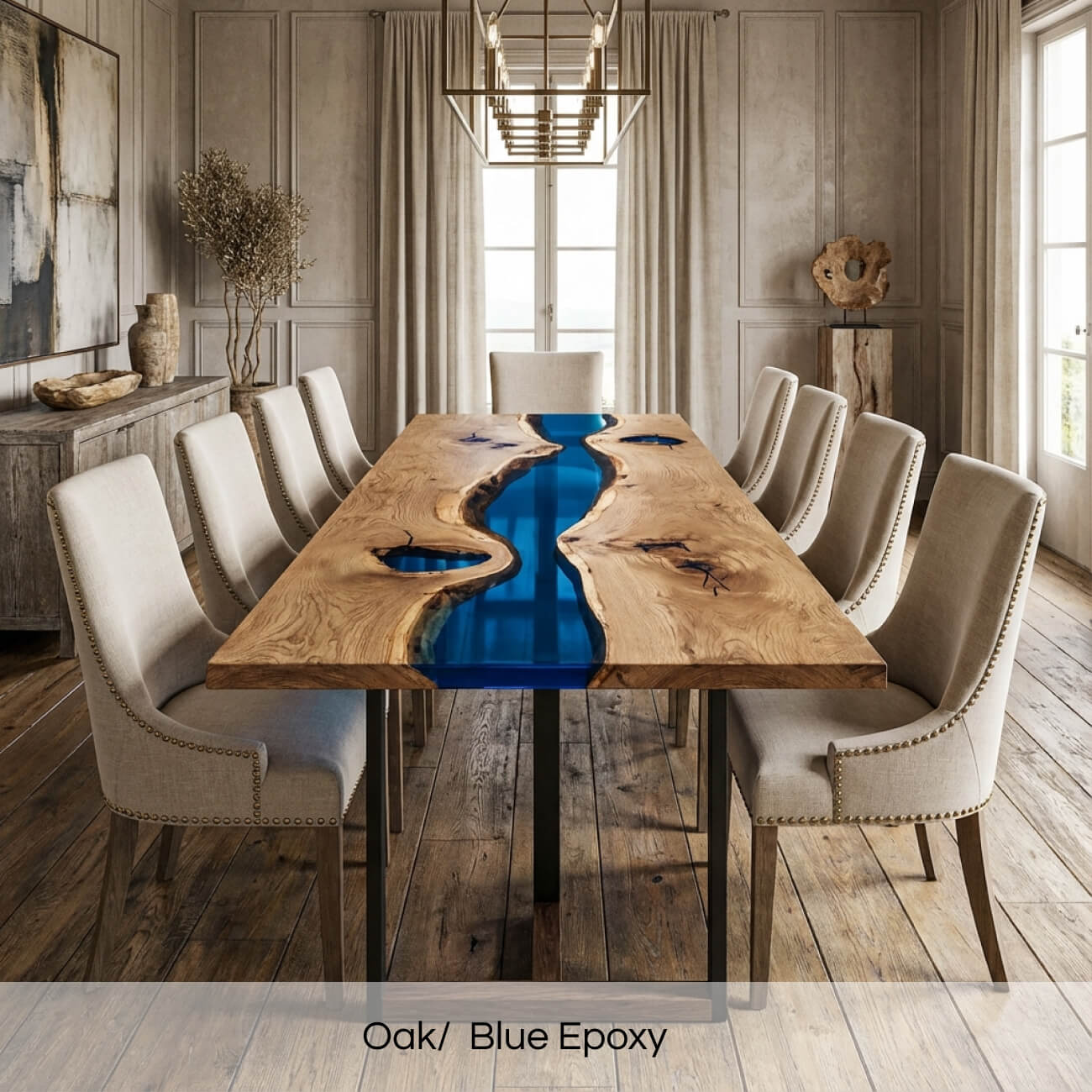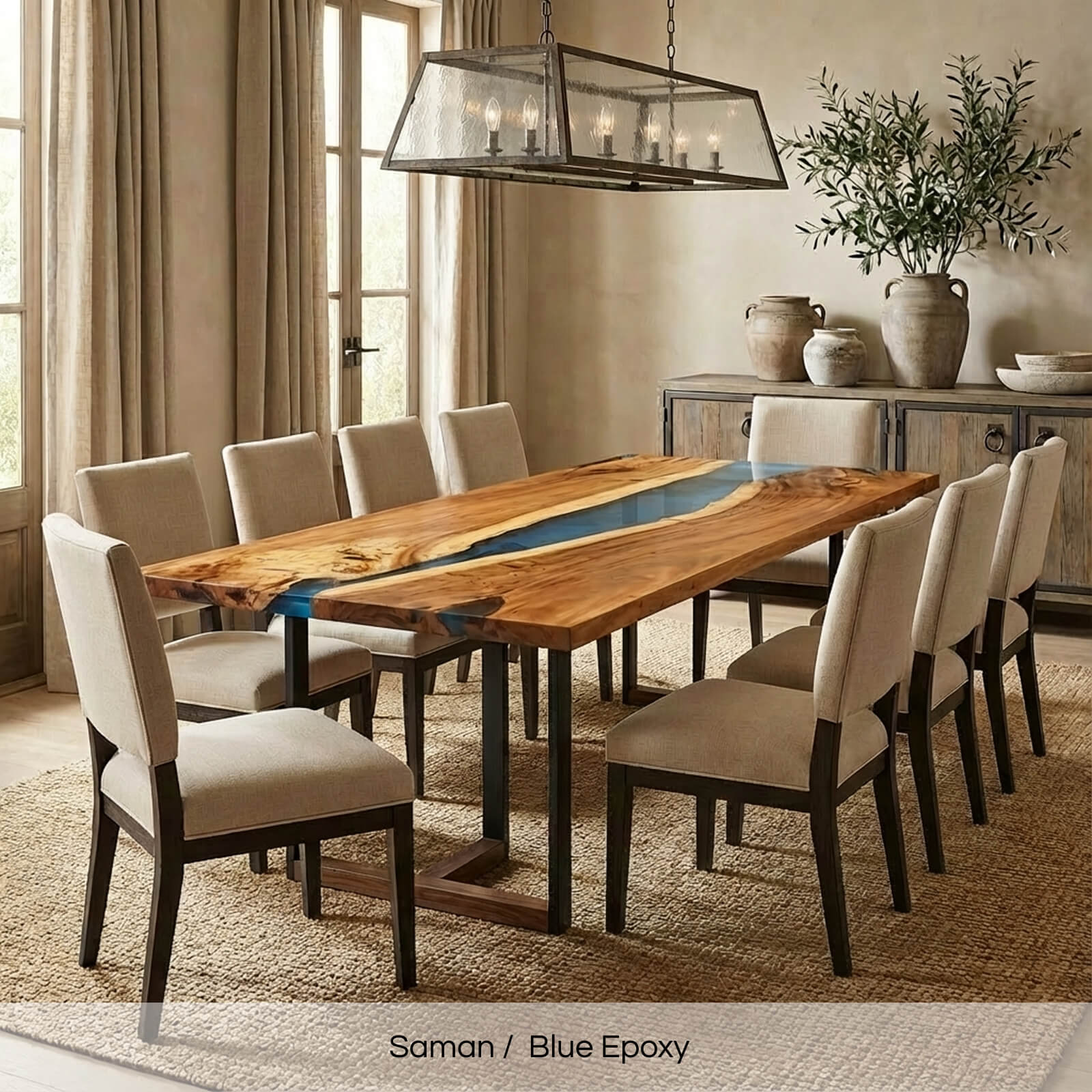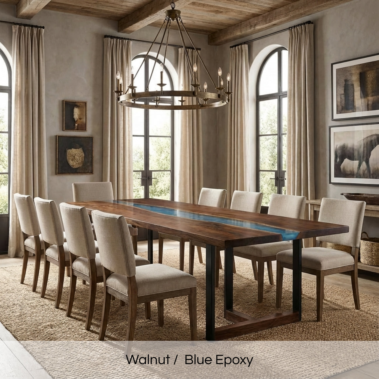 The Tuco Epoxy Dining Table is designed for large dining spaces where scale, structure, and material contrast are intentional. Solid wood slabs form the tabletop, while epoxy is used as a controlled design element to stabilize and highlight natural transitions in the wood.