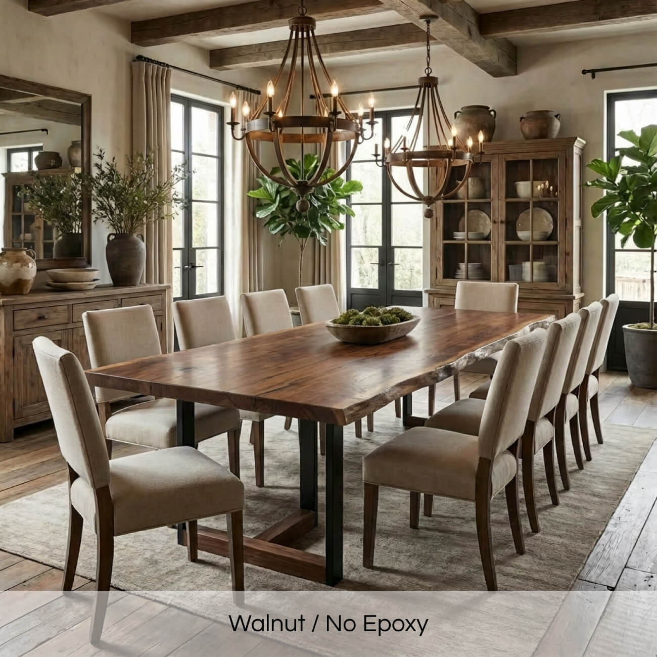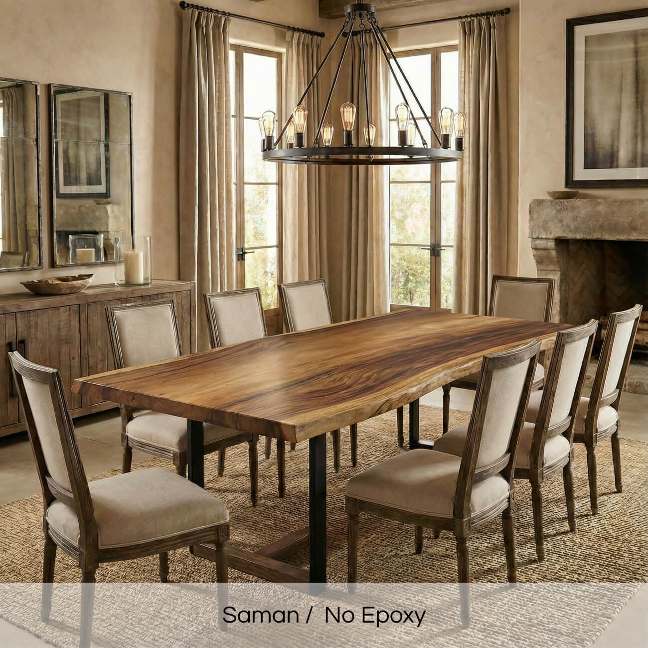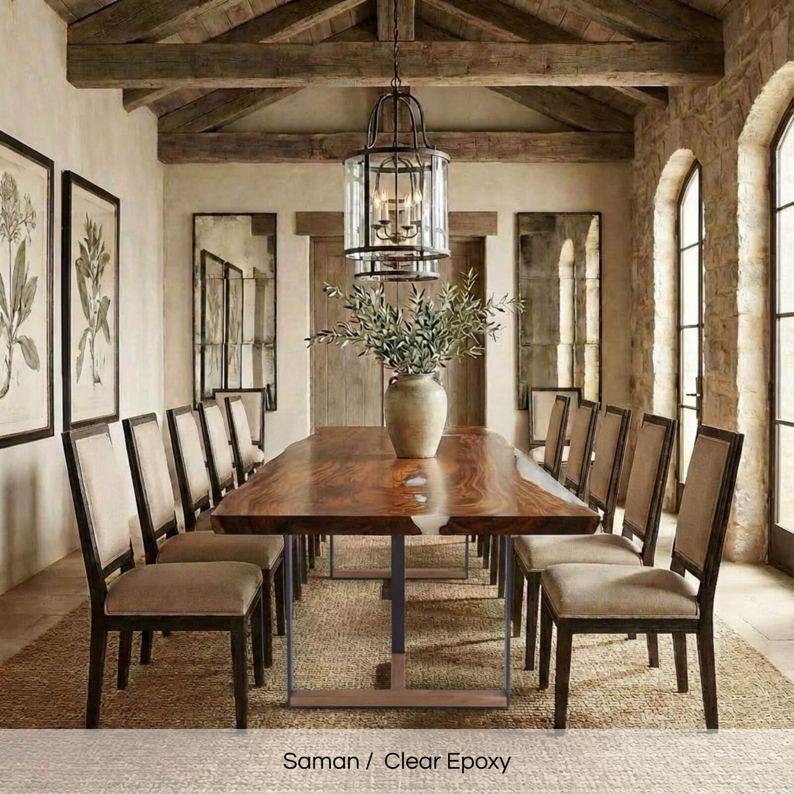 The Tuco Epoxy Dining Table is designed for large dining spaces where scale, structure, and material contrast are intentional. Solid wood slabs form the tabletop, while epoxy is used as a controlled design element to stabilize and highlight natural transitions in the wood.