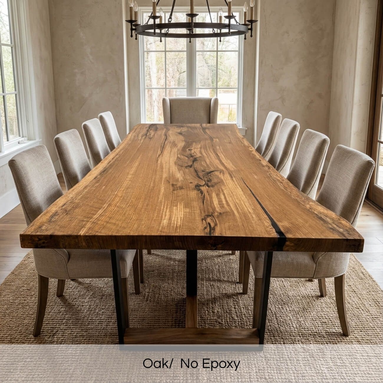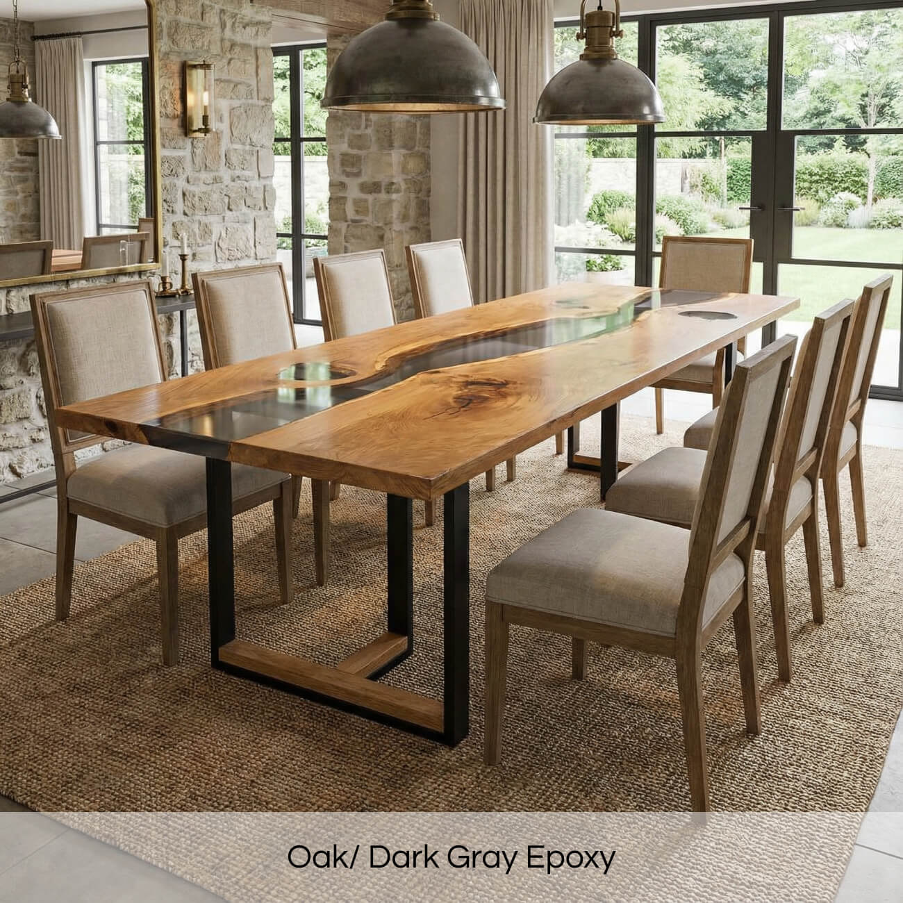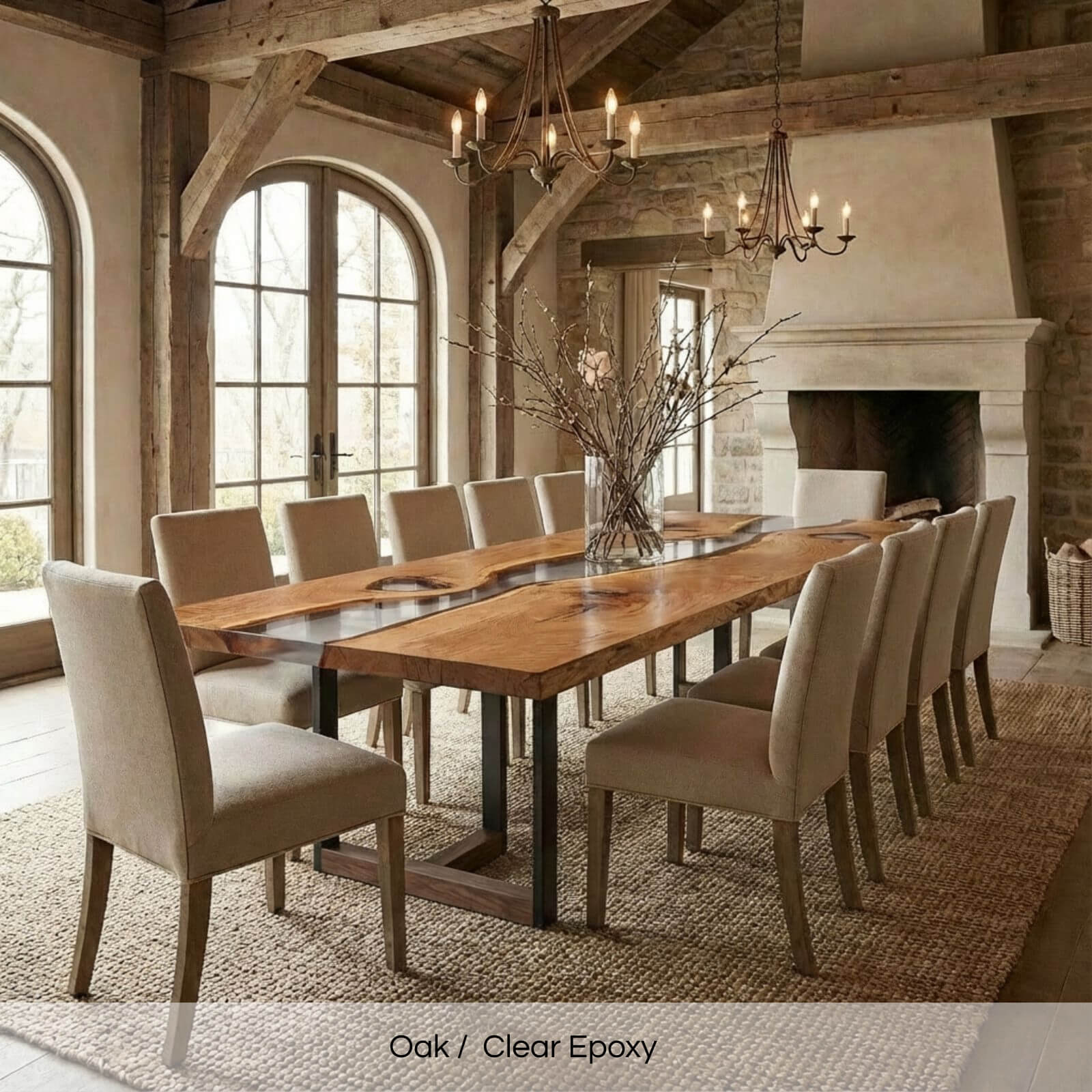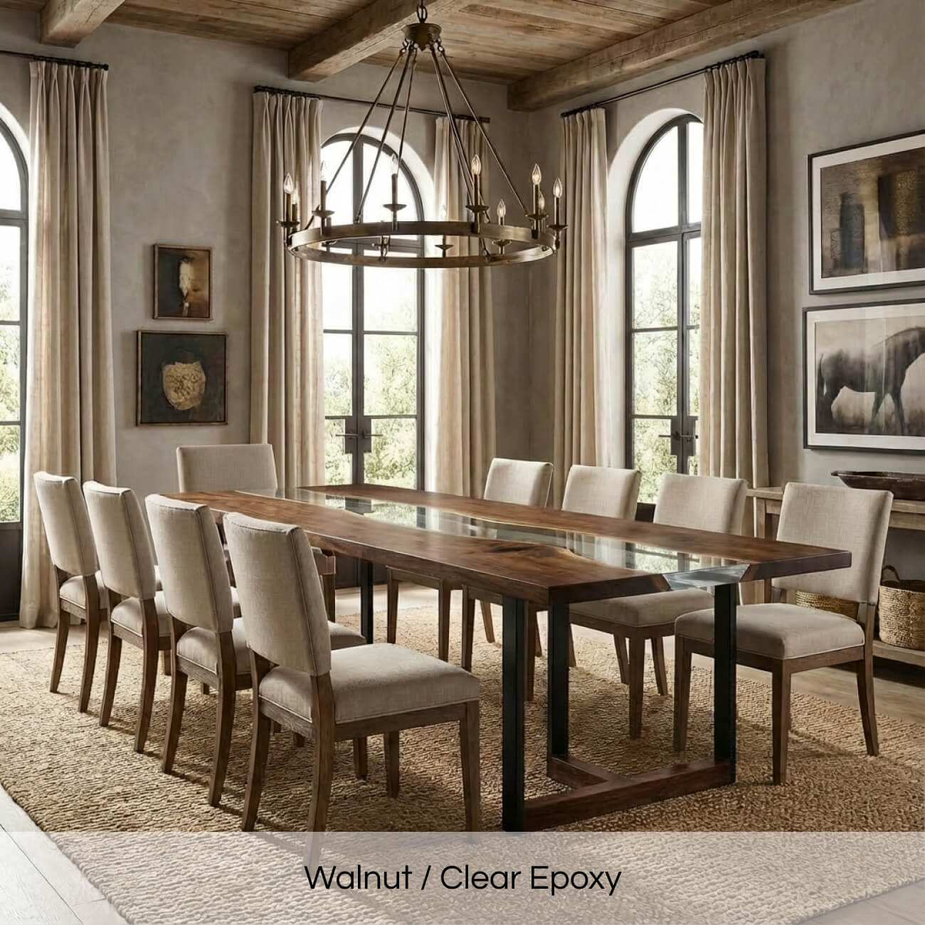 A large-format dining table defined by solid wood, controlled epoxy, and a steel-and-wood base